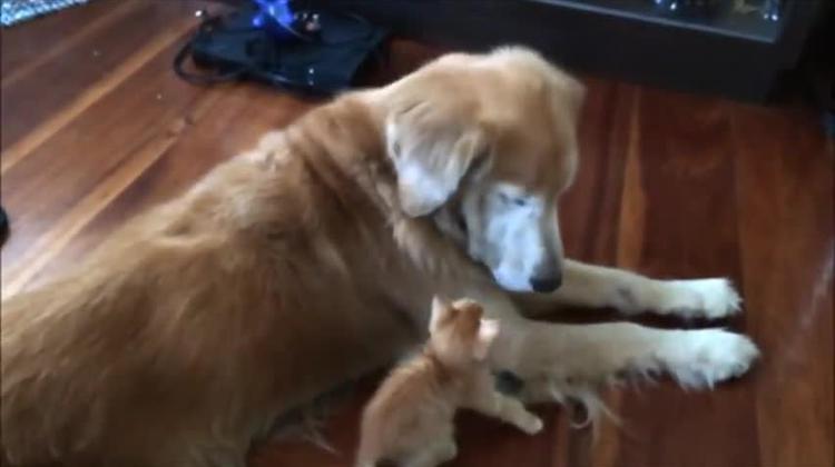Бебе котенце си играе с голямо куче - ето това е да имаш приятел - Videoclip.bg