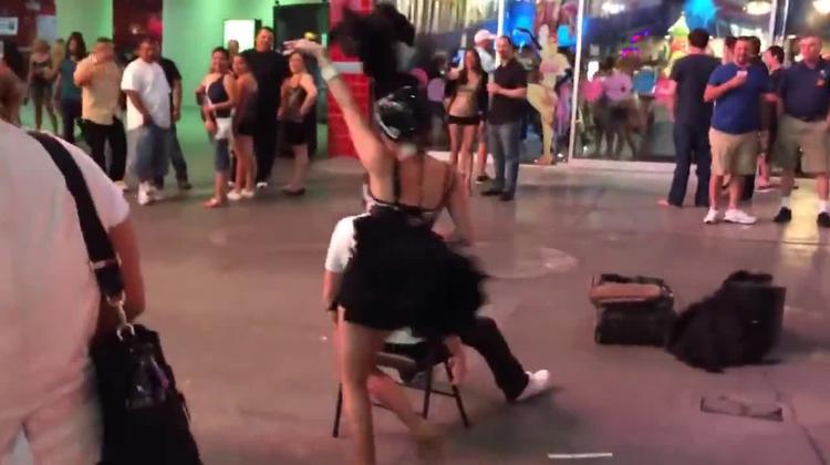 Вижте голям смях!!! Танцьорка се напикава върху мъж, по време на улично шоу в Лас Вегас! - Videoclip.bg