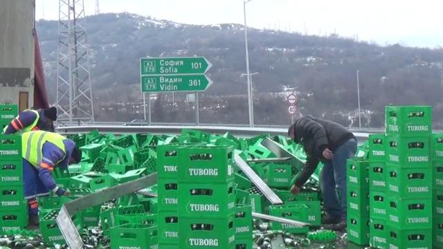 Бира се лее на магистрала Струма - ТИР „Волво” със сръбска регистрация изсипа стотици бутилки бира "Туборг" на магистрала "Струма" край Благоевград.