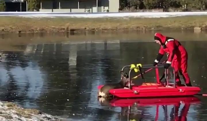 Пожарникар спаси елен, "заклещен" в езеро VIDEO Firefighters save Deer stuck on frozen Lake